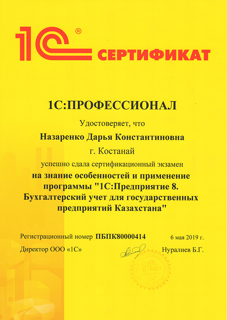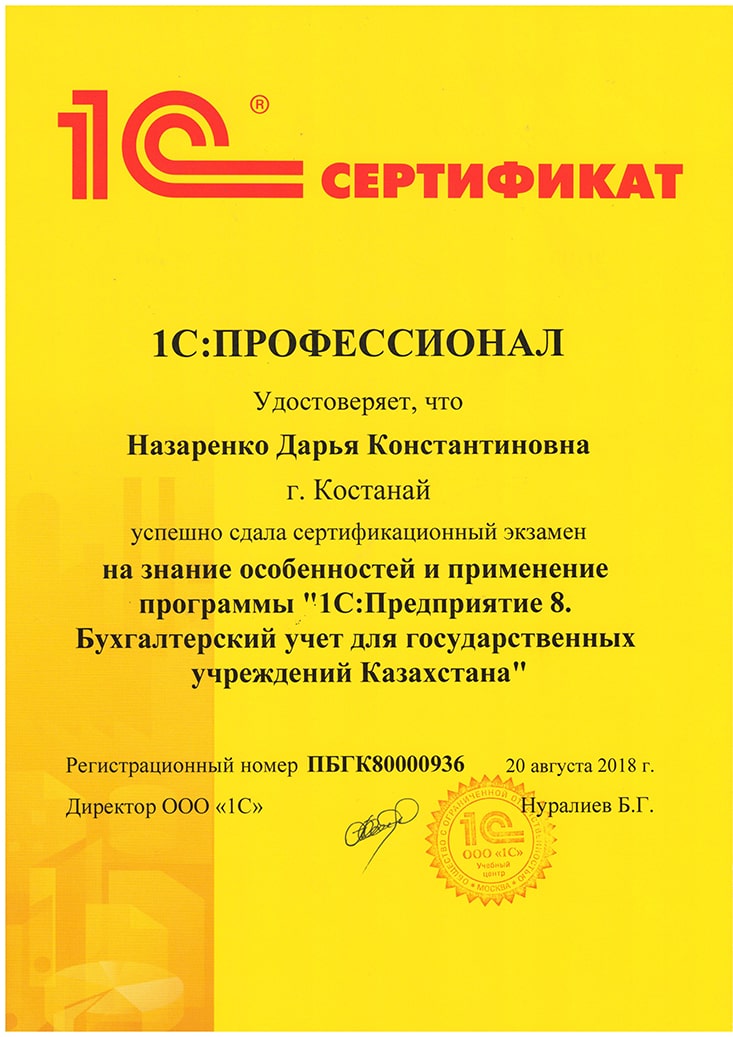 1С:Предприятие 8. Бухгалтерский учёт для государственных учреждений Казахстана, Назаренко Дарья