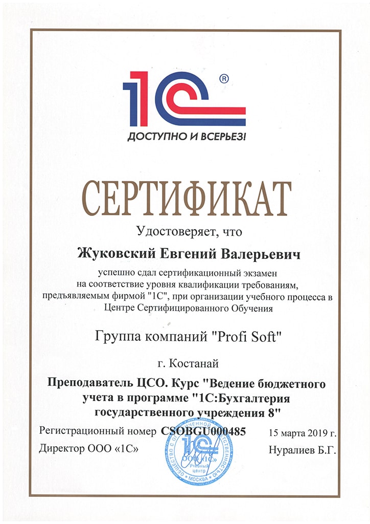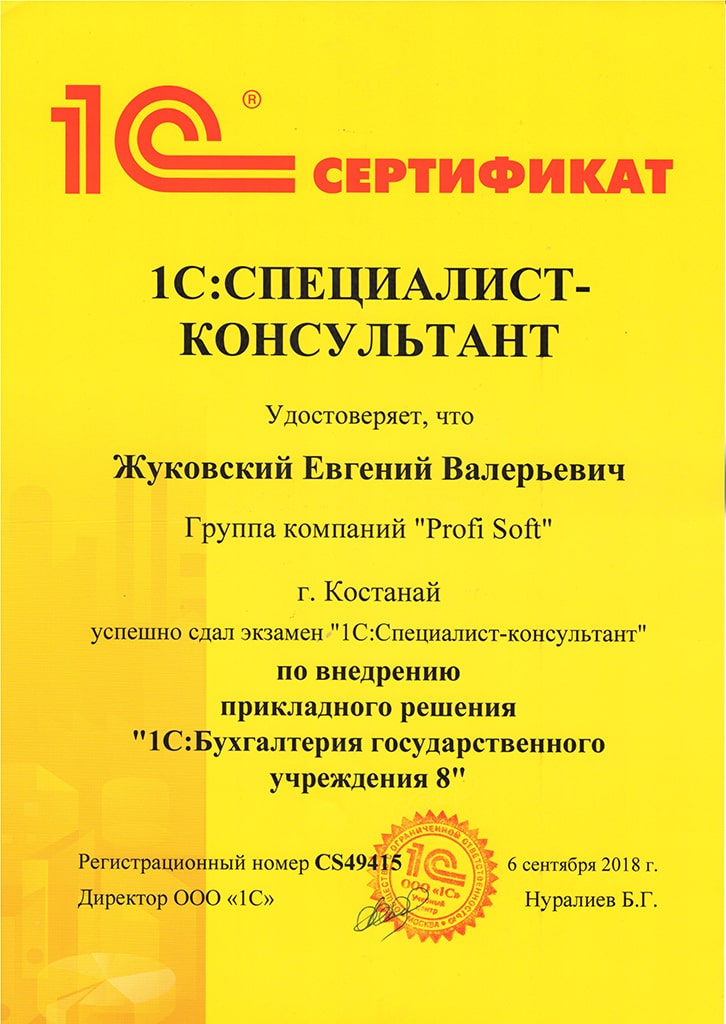 1С:Специалист-консультант по внедрению прикладного решения "1С: Бухгалтерия государственного учреждения 8", Жуковский Евгений