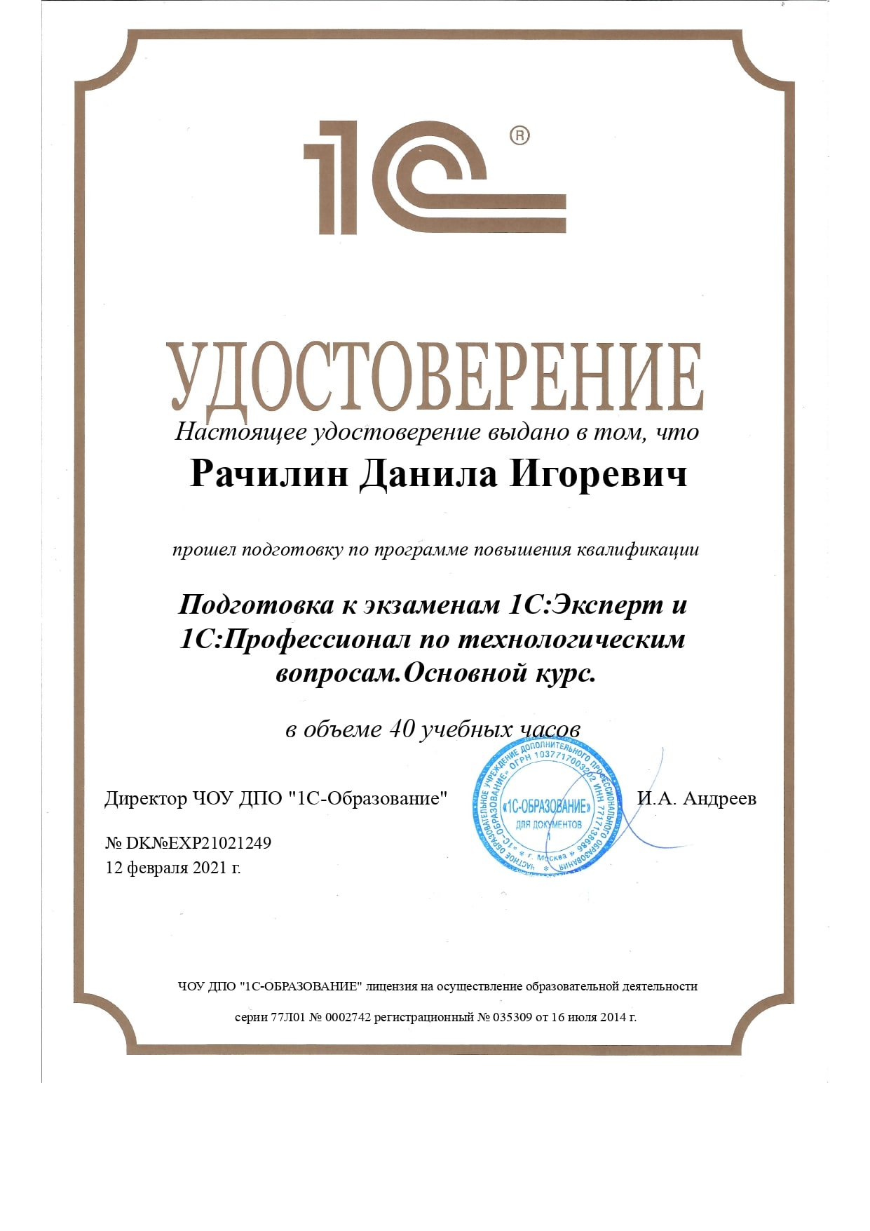 1С: Профессионал (Экзамен по технологическим вопросам) - Рачилин Данила