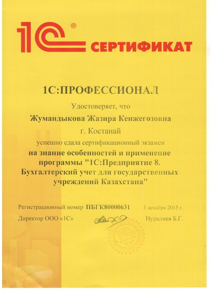 1С:Предприятие 8. Бухгалтерский учёт для государственных учреждений Казахстана, Жумандыкова Жазира