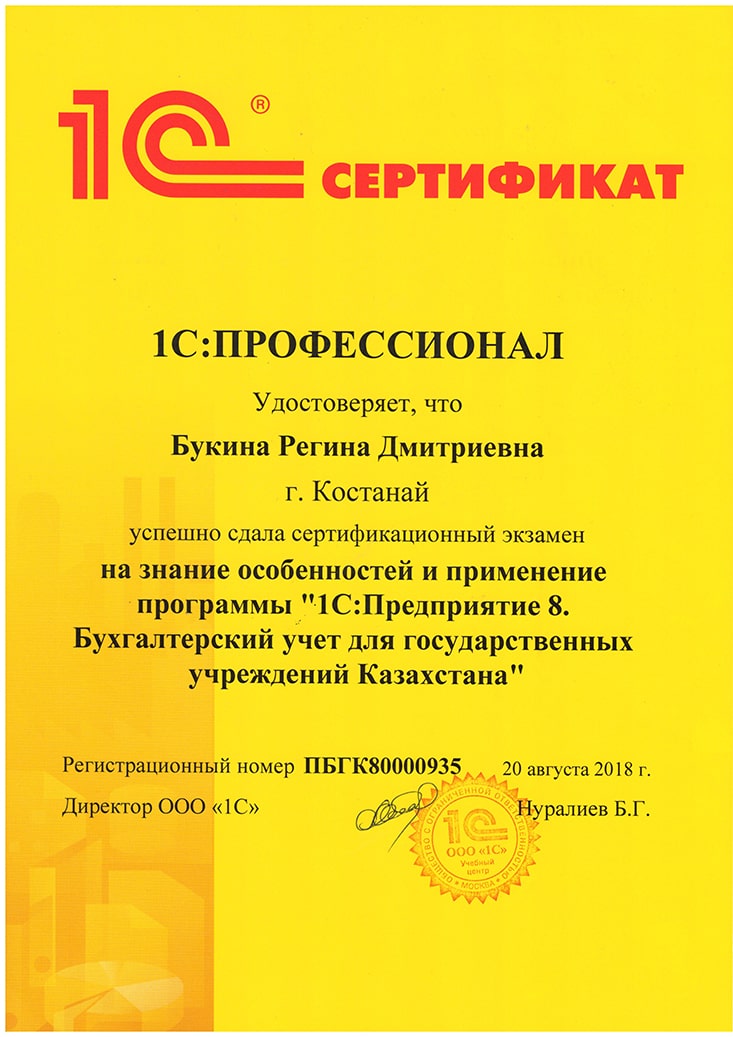 1С:Предприятие 8. Бухгалтерский учёт для государственных учреждений Казахстана, Букина Регина