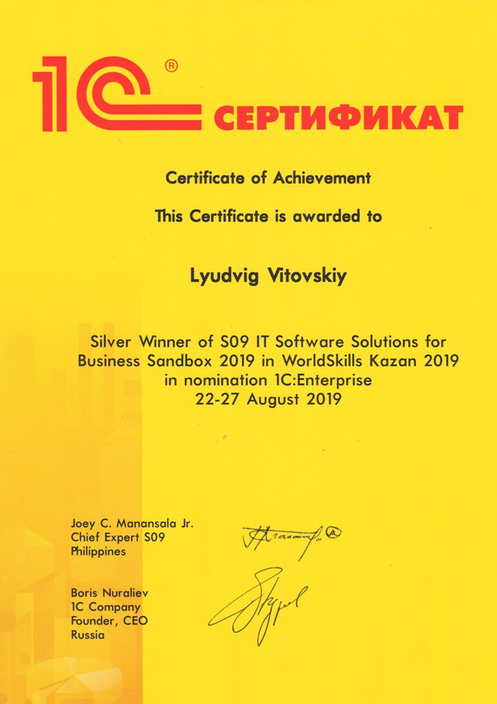 Серебренный призёр в номинации 1С: Предприятие WorldSkills Kazan 2019, Витовский Людвиг