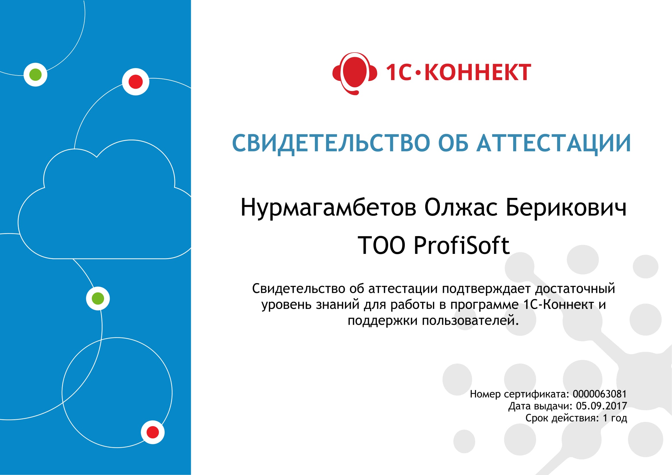 Работа в программе и поддержка пользователей 1С-Коннект, Нурмагамбетов Олжас
