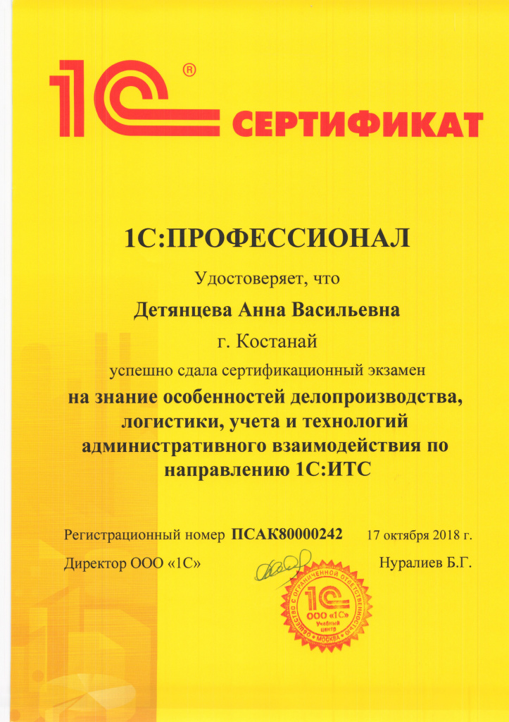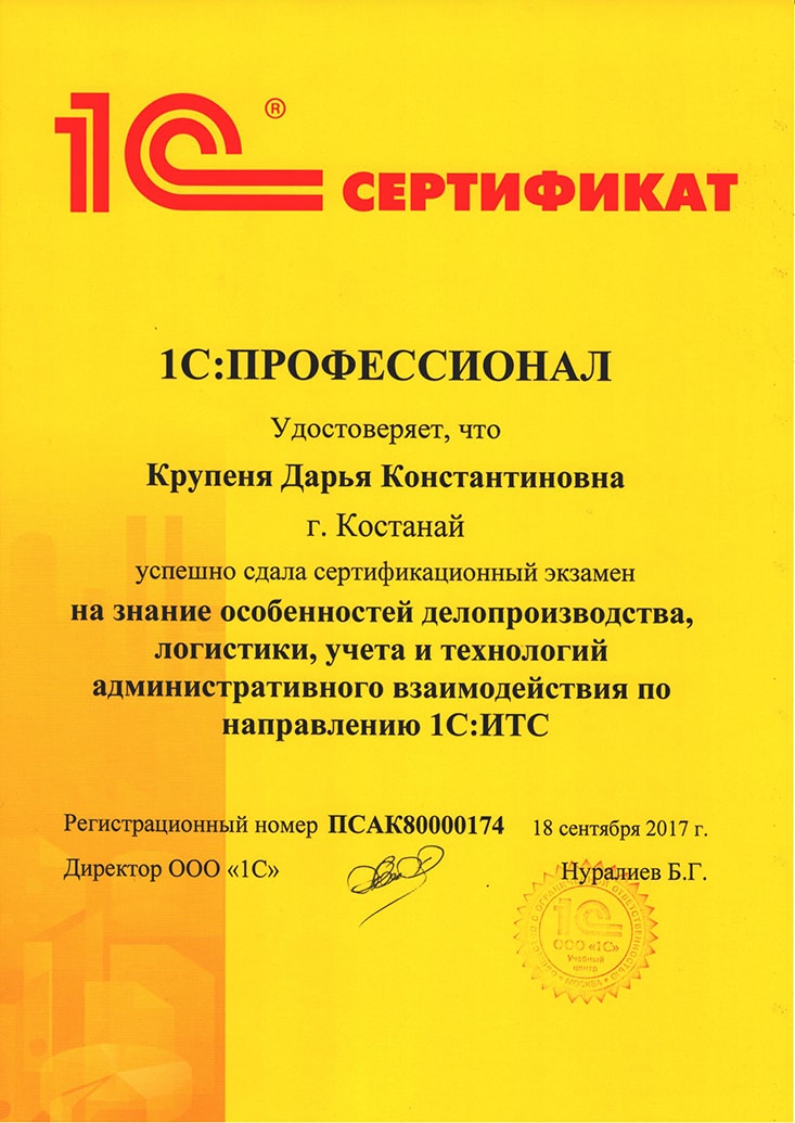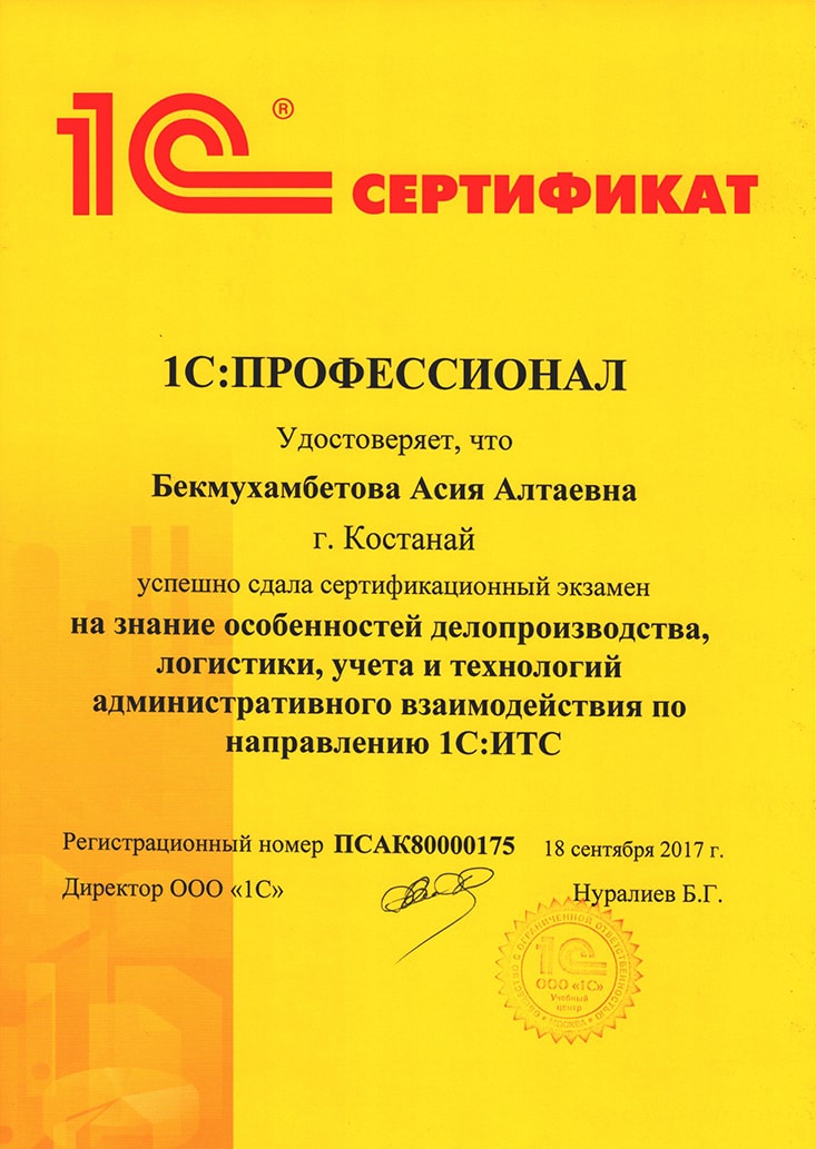 Особенности делопроизводства, логистики, учёта и технологий административного взаимодействия по направлению 1С:ИТС, Нурмагамбетов Олжас