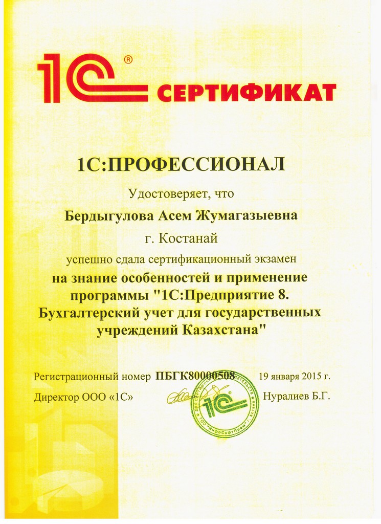 1С:Предприятие 8. Бухгалтерский учёт для государственных учреждений Казахстана, Бердыгулова Асем