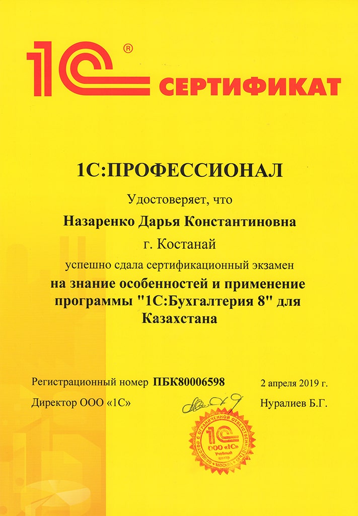 "1С:Бухгалтерия 8" для Казахстана, Назаренко Дарья