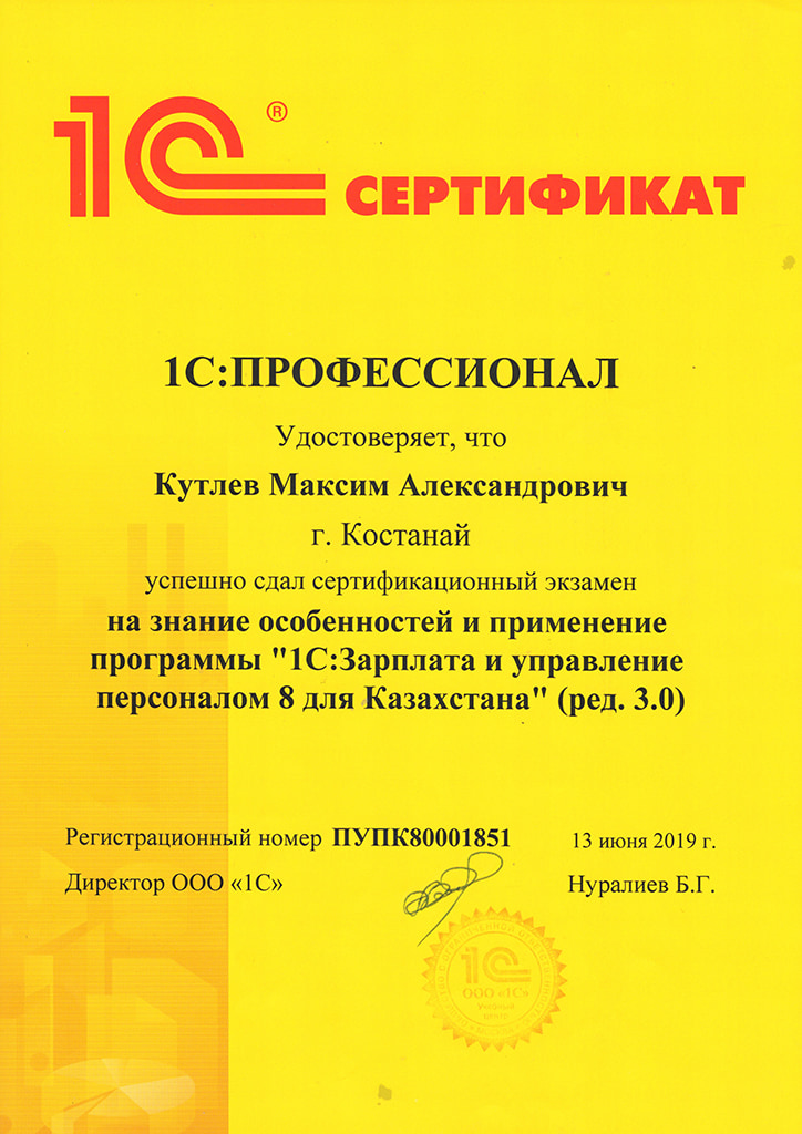 "1С:Зарплата и управление персоналом 8 для Казахстана" (ред 3.0), Кутлев Максим