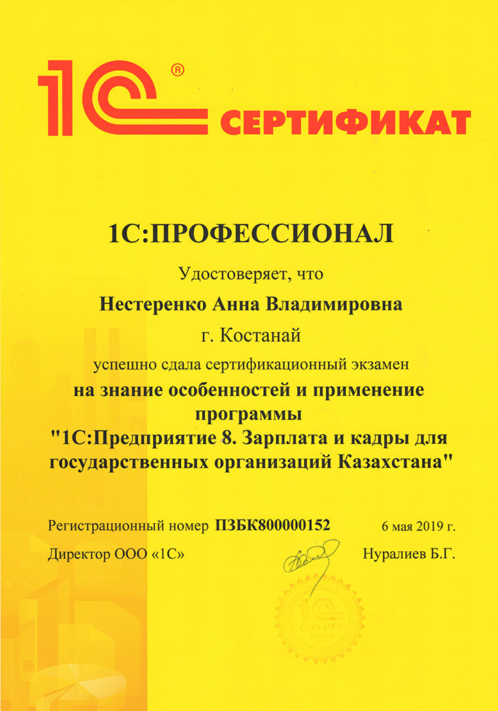 1С:Предприятие 8. Зарплата и кадры для государственных организаций Казахстана, Нестеренко Анна