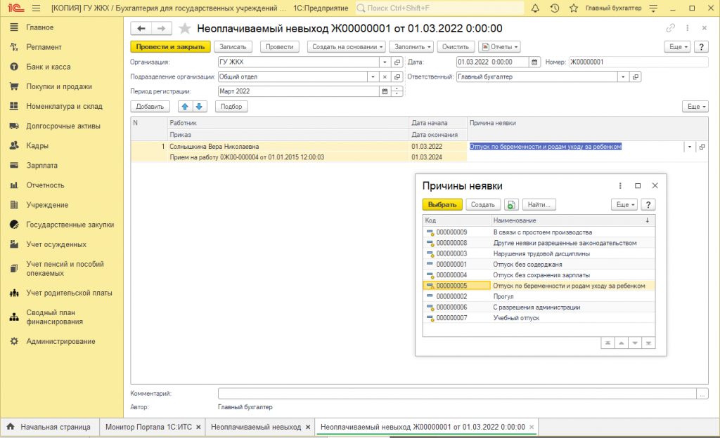 В шапке документа заполняется Период регистрации», заполнение этого реквизита нужно для корректного учета отработанного времени при начислении заработной платы. В табличной части документа указывается работник, период его отсутствия на работе и причина неявки. Причина неявки выбирается из справочника «Причины неявок».