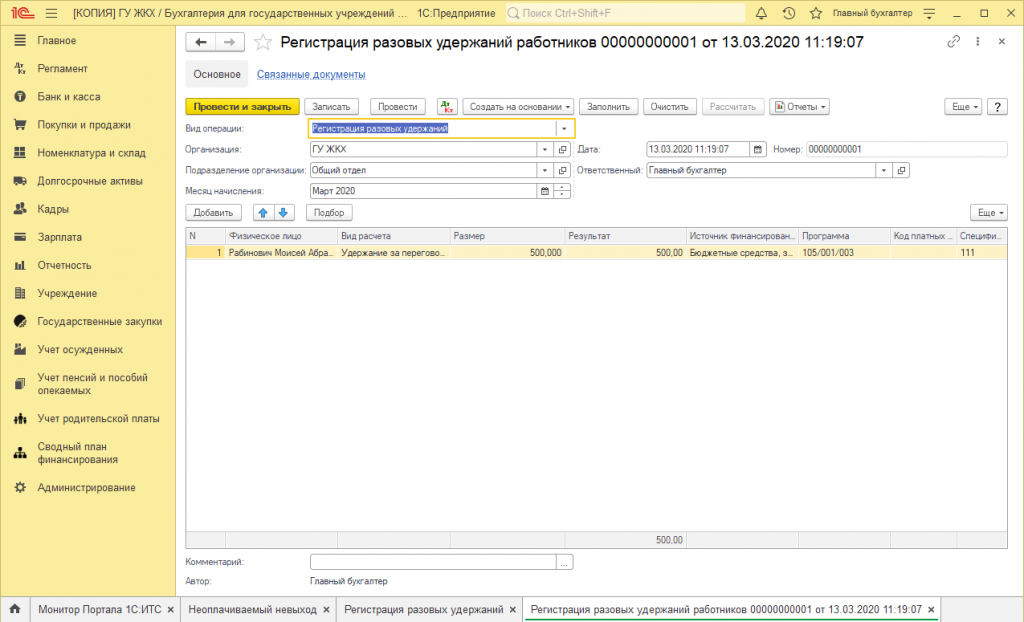Существуют удержания, которые могут иметь место не каждый месяц. Для их регистрации используется документ Регистрация разовых удержаний работников организаций. Его можно открыть через меню «Зарплата – Регистрация разовых удержаний». Документ «Регистрация разовых удержаний работников» позволяет рассчитать любое удержание, не регистрируя его с помощью документа «Ввод сведений о плановых удержаниях». Рассмотрим заполнение табличной части документа:
