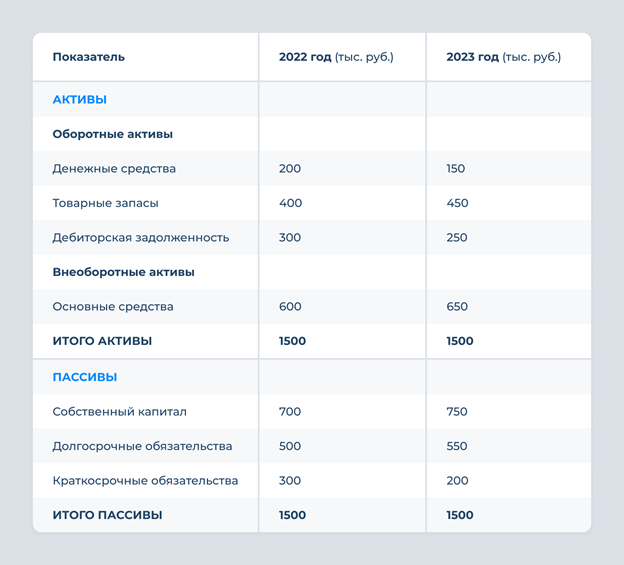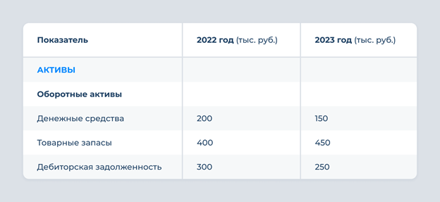 Денежные средства снизились с 200 тыс. руб. до 150 тыс. руб. Здесь возможны различные причины, такие как увеличение операционных расходов, инвестиции в основные средства или выплаты по долгам. Чтобы выяснить причину снижения, необходимо проанализировать денежные потоки.