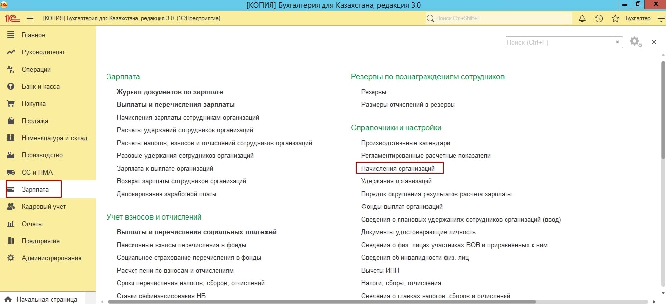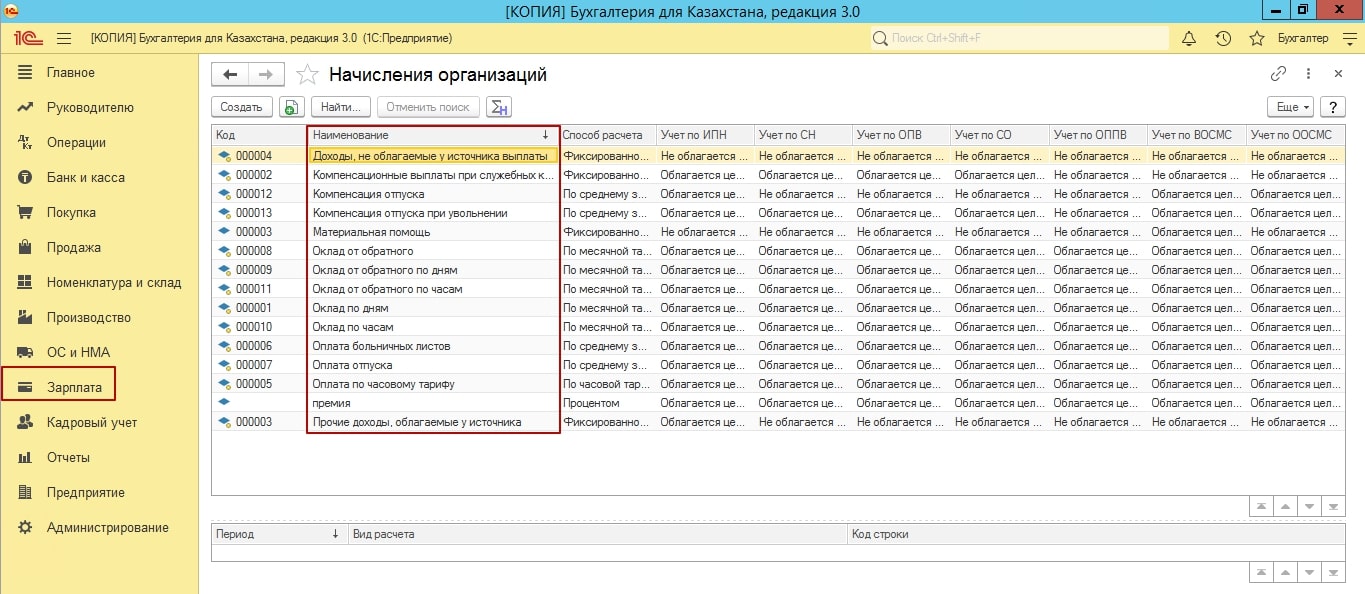 Переходим в подсистему «Зарплата – Начисления организаций». В данном журнале собраны все виды начислений, которые используются при начислениях заработной платы сотрудникам.