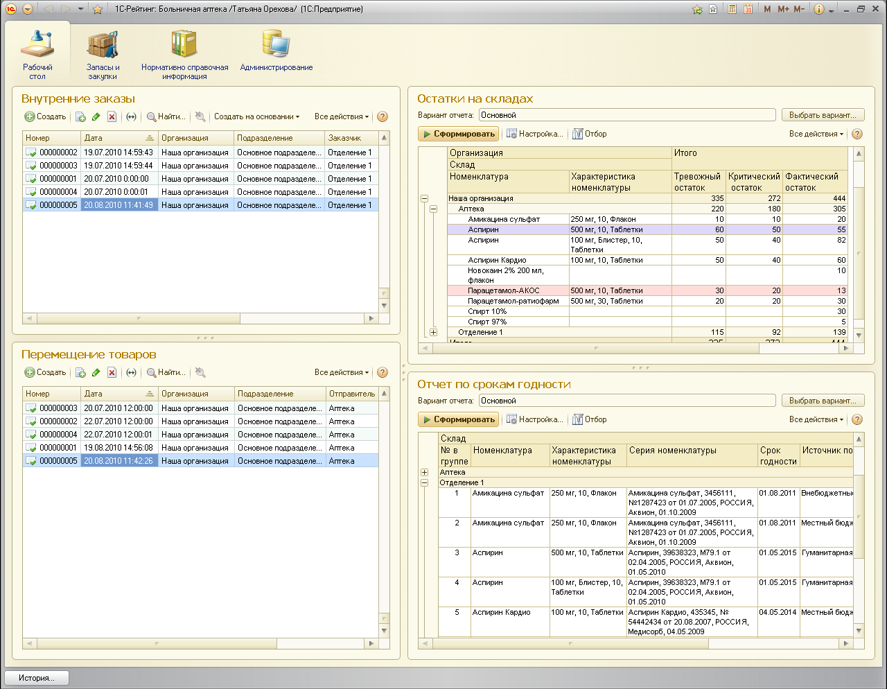 Конфигурация «1С-Рейтинг: Больничная аптека» позволяет автоматизировать полный цикл оборота лекарственных средств, медицинских изделий, техники и прочих аптечных товаров в больничных аптеках и отделениях (кабинетах, постах) организаций здравоохранения, начиная от формирования заказов поставщикам и поступления лекарственных средств в больничные аптеки, и заканчивая отпуском лекарственных средств по назначениям из отделений (кабинетов, постов).